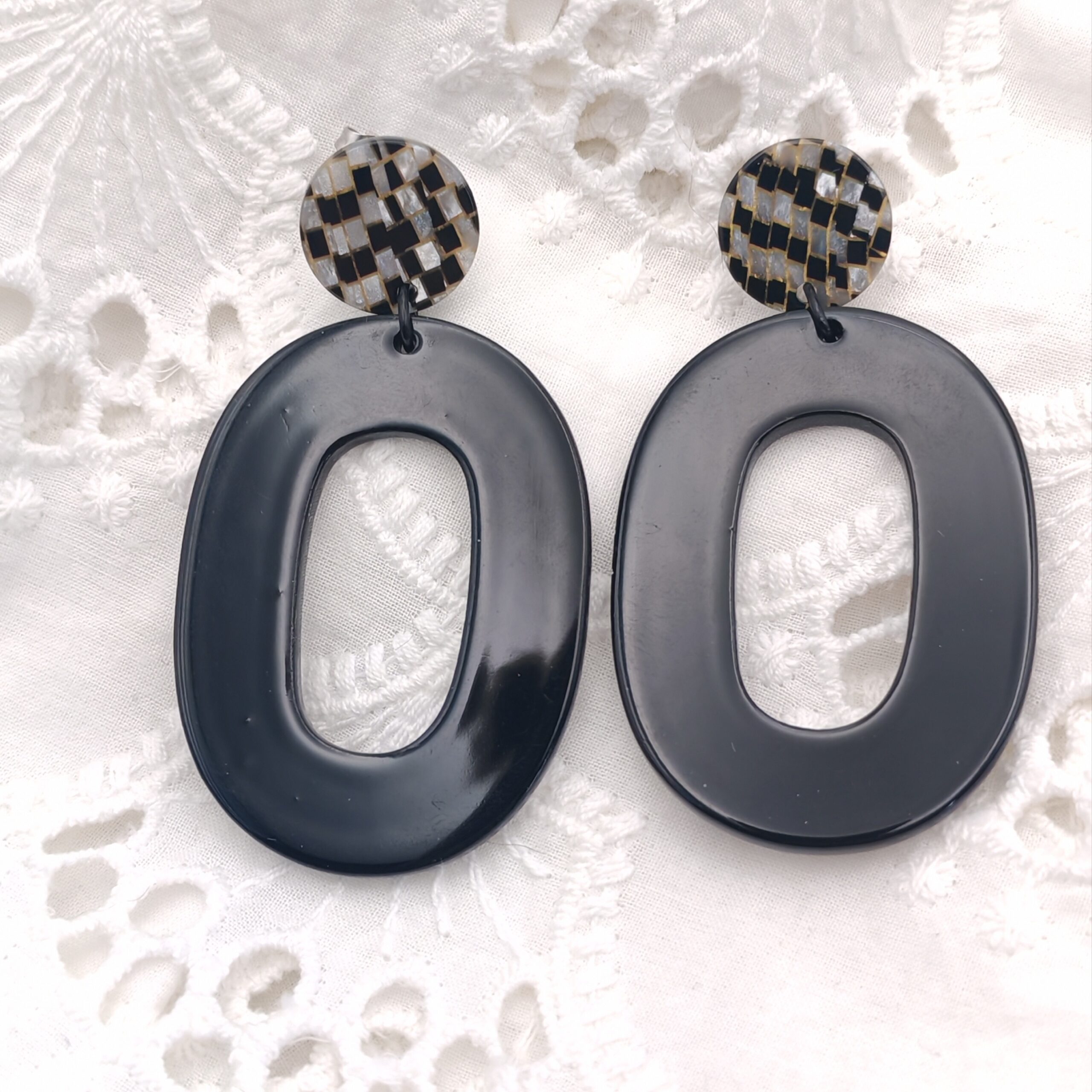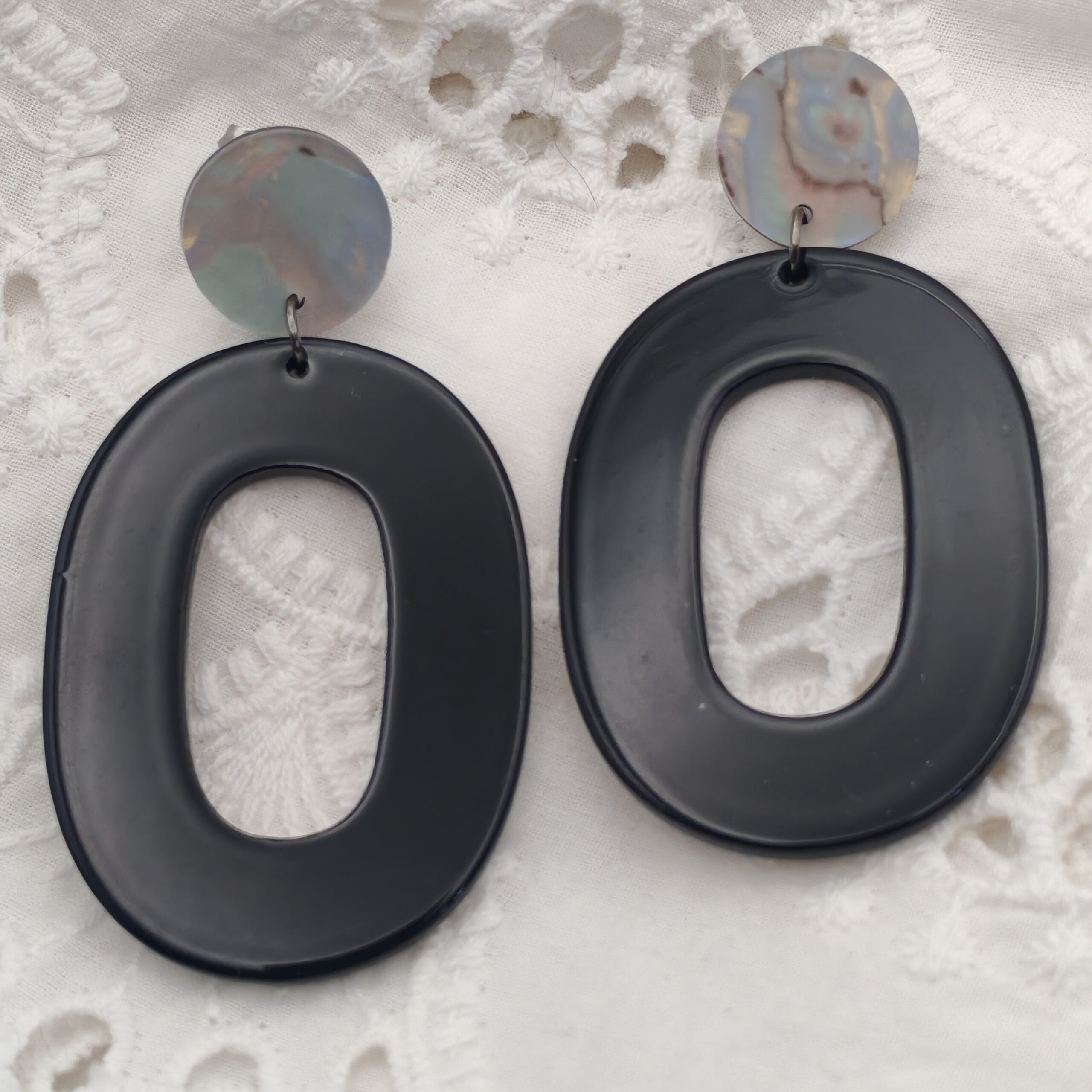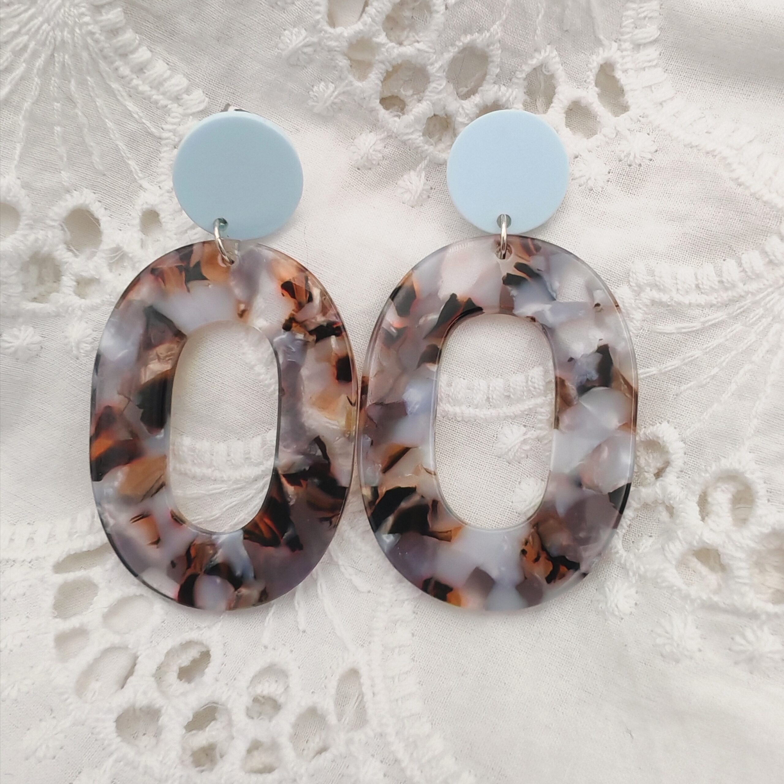 Boucle composé d’un clou d’oreille et d’un pendentif en acétate de cellulose.