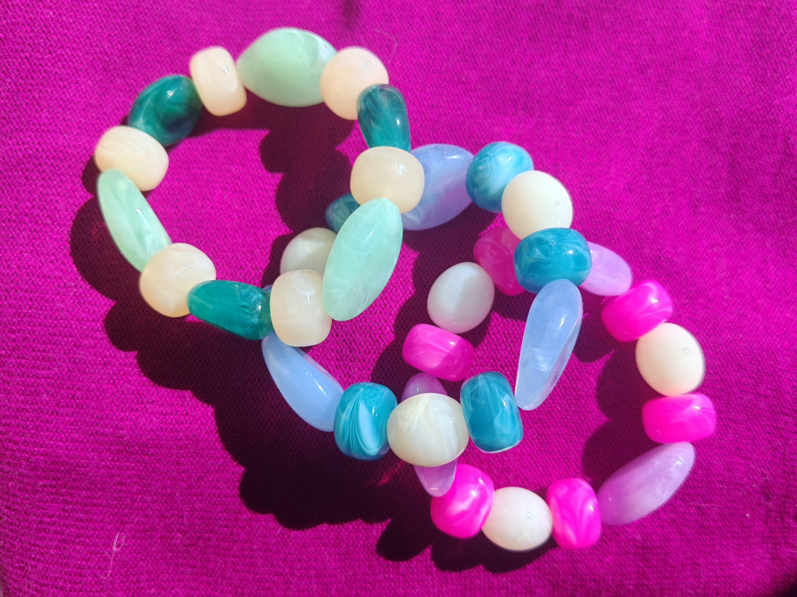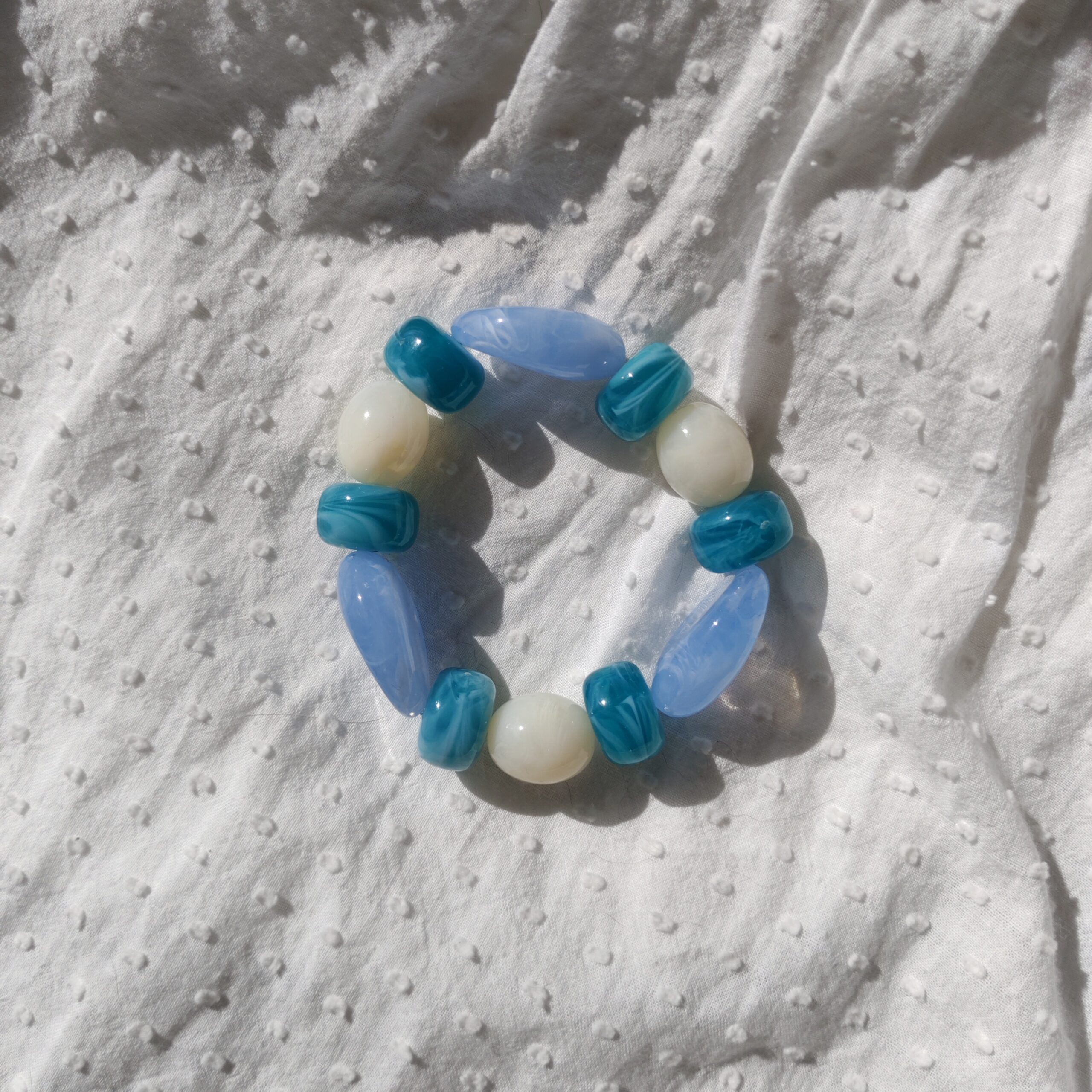 Bracelet en résine colorée dans les tons bleu et blanc laiteux, assorti au collier Antéia.