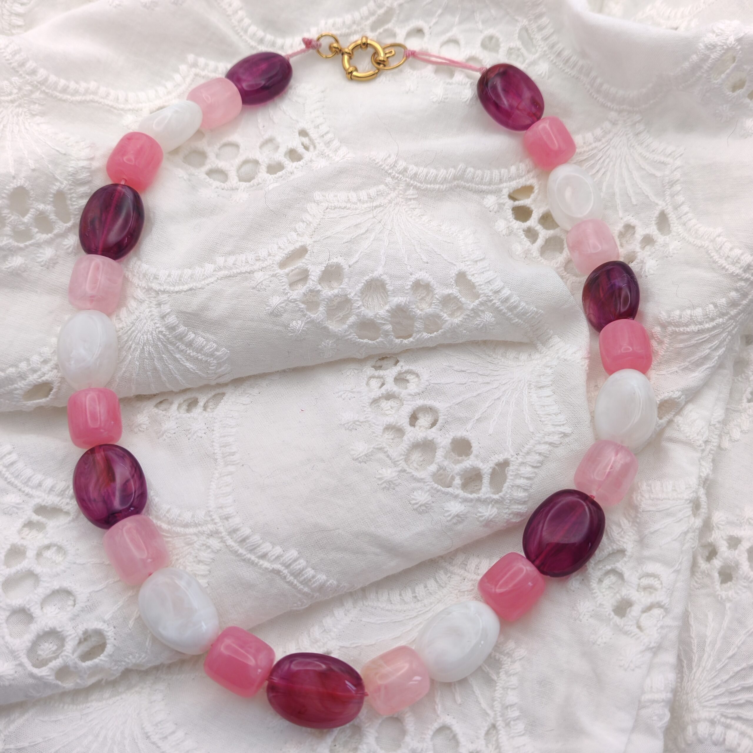 Naia incarne l’éclosion estivale. Ses perles aux nuances rosées, framboise et nacrées évoquent un jardin en pleine lumière, lorsque les pétales s’ouvrent sous le soleil chaud. Délicate mais vibrante, cette pièce habille le cou avec douceur tout en révélant une énergie florale affirmée.