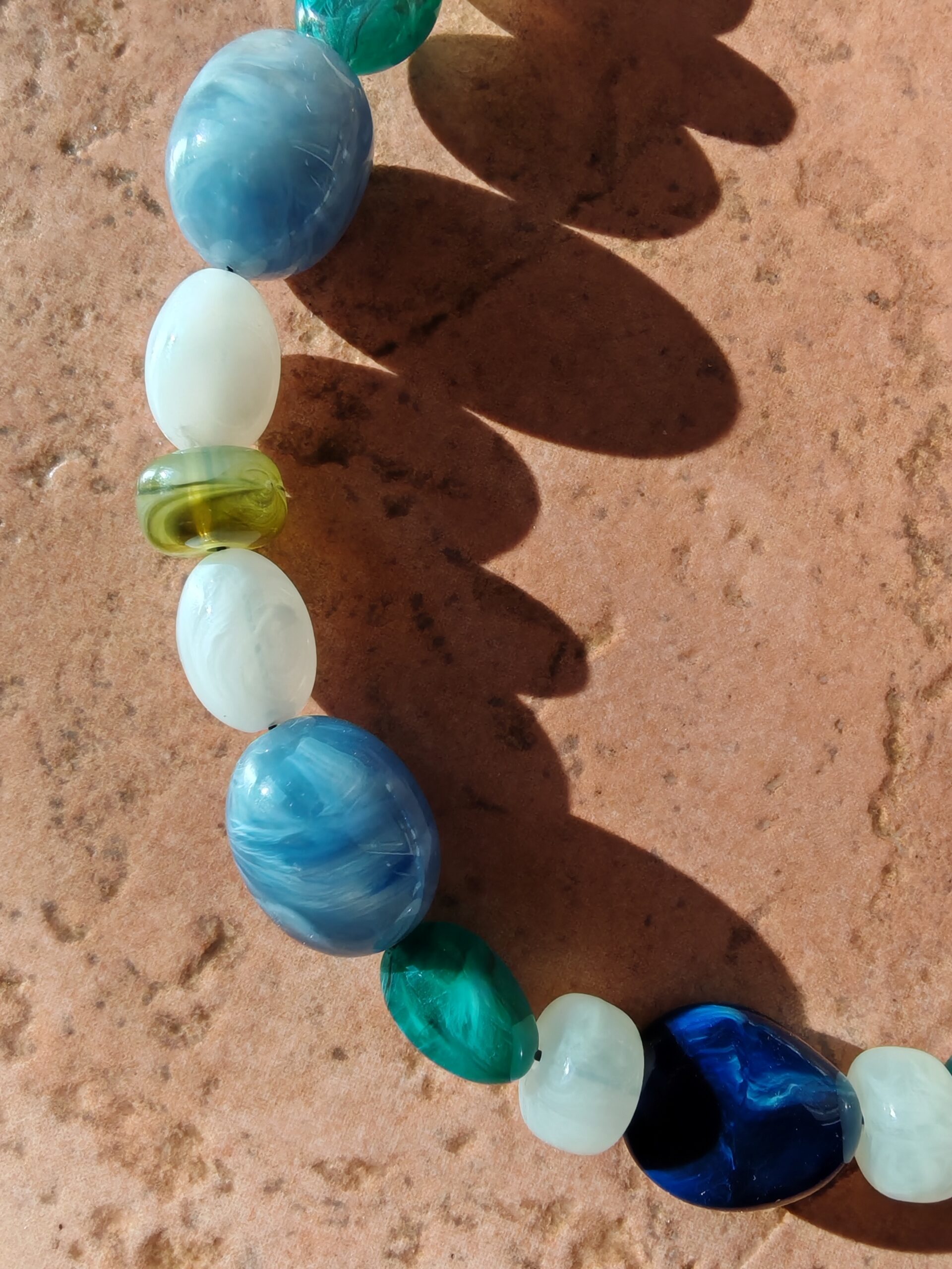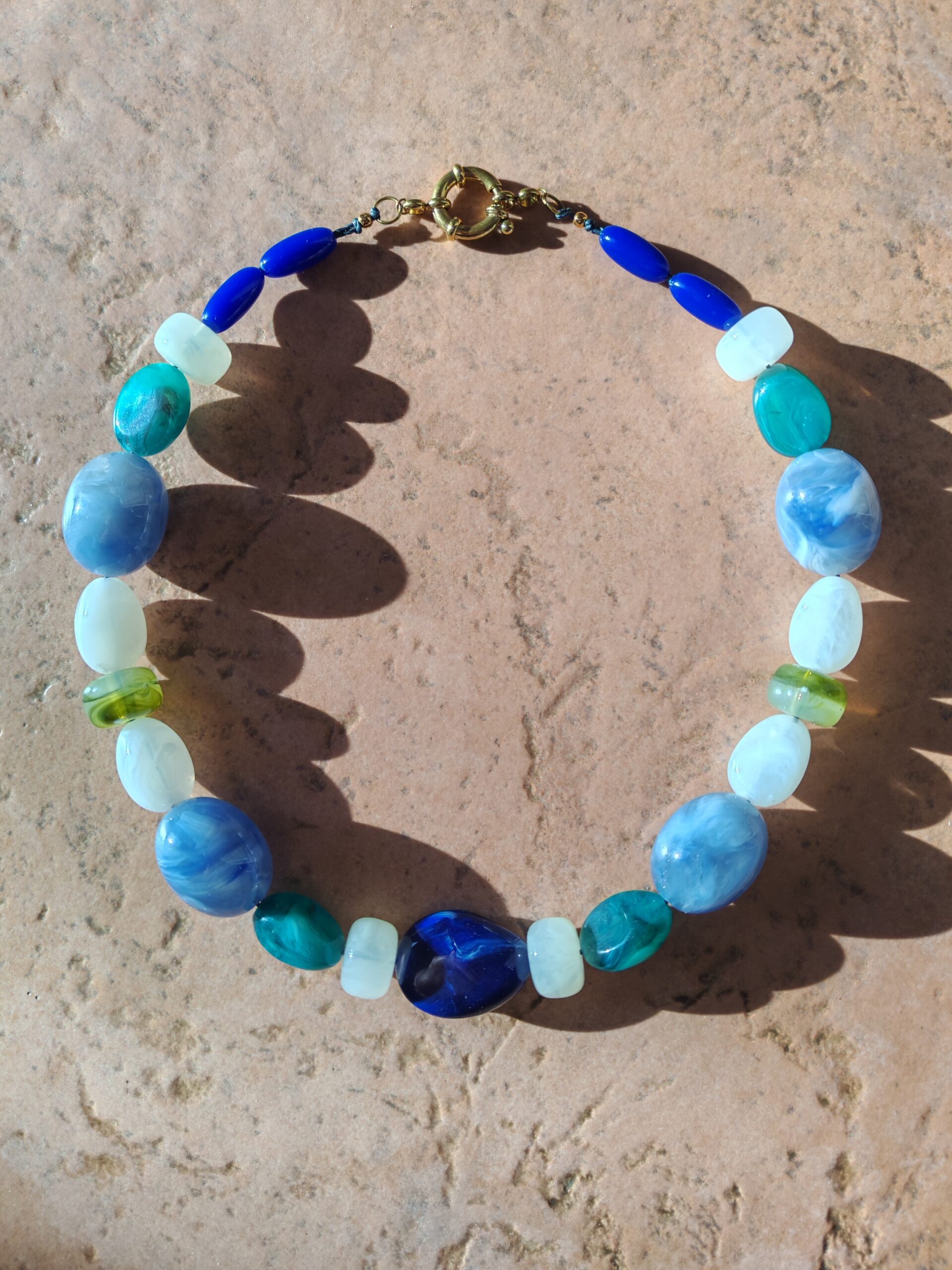 Les perles bleu glacier, bleu profond et vert émeraude apportent une touche fraiche et lumineuse, comme un souffle d’énergie nouvelle.