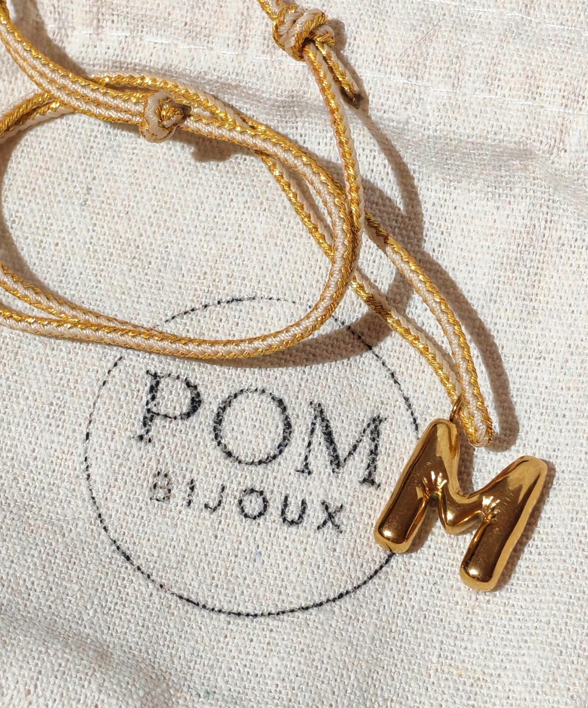 Lettre montée sur cordon crème/noir et doré.