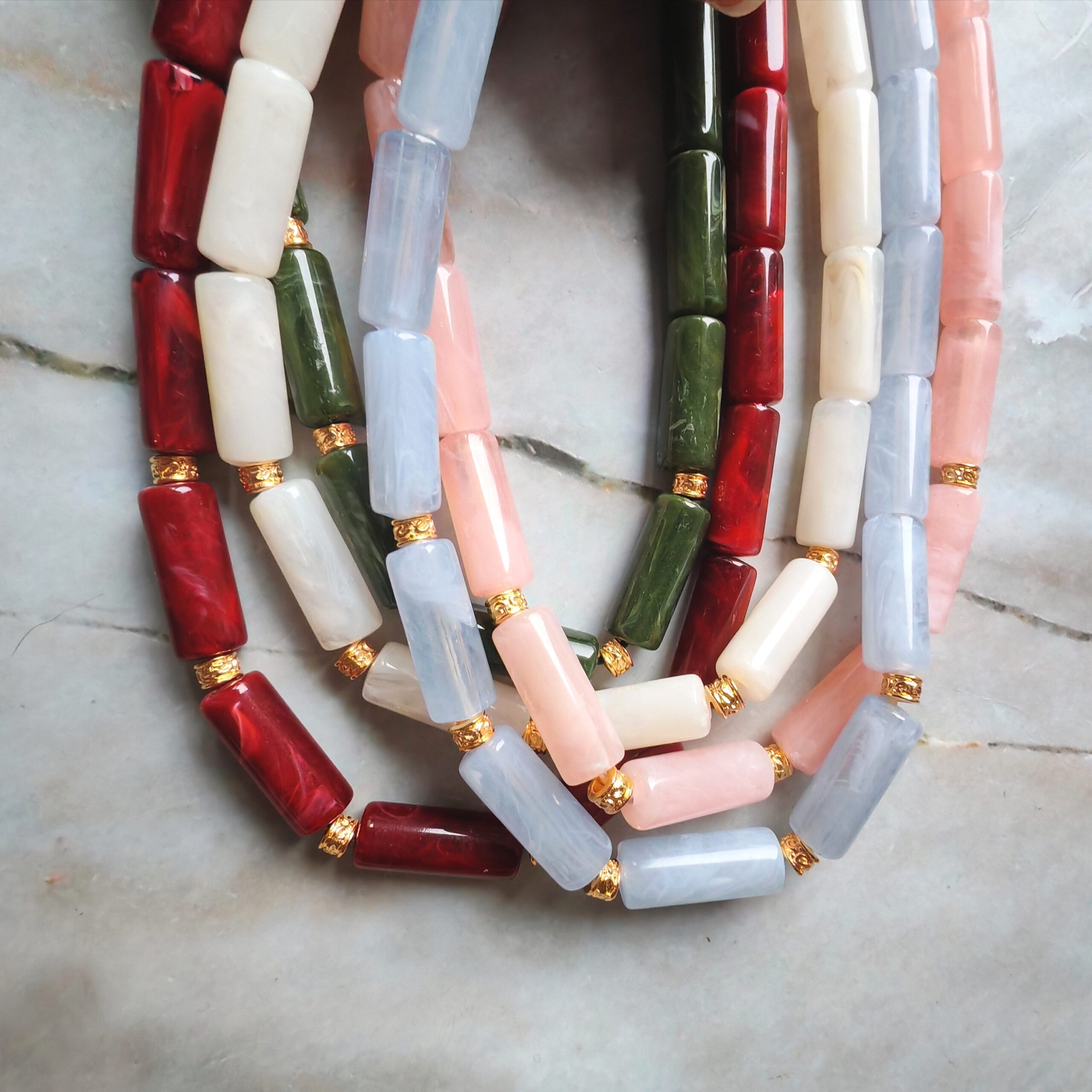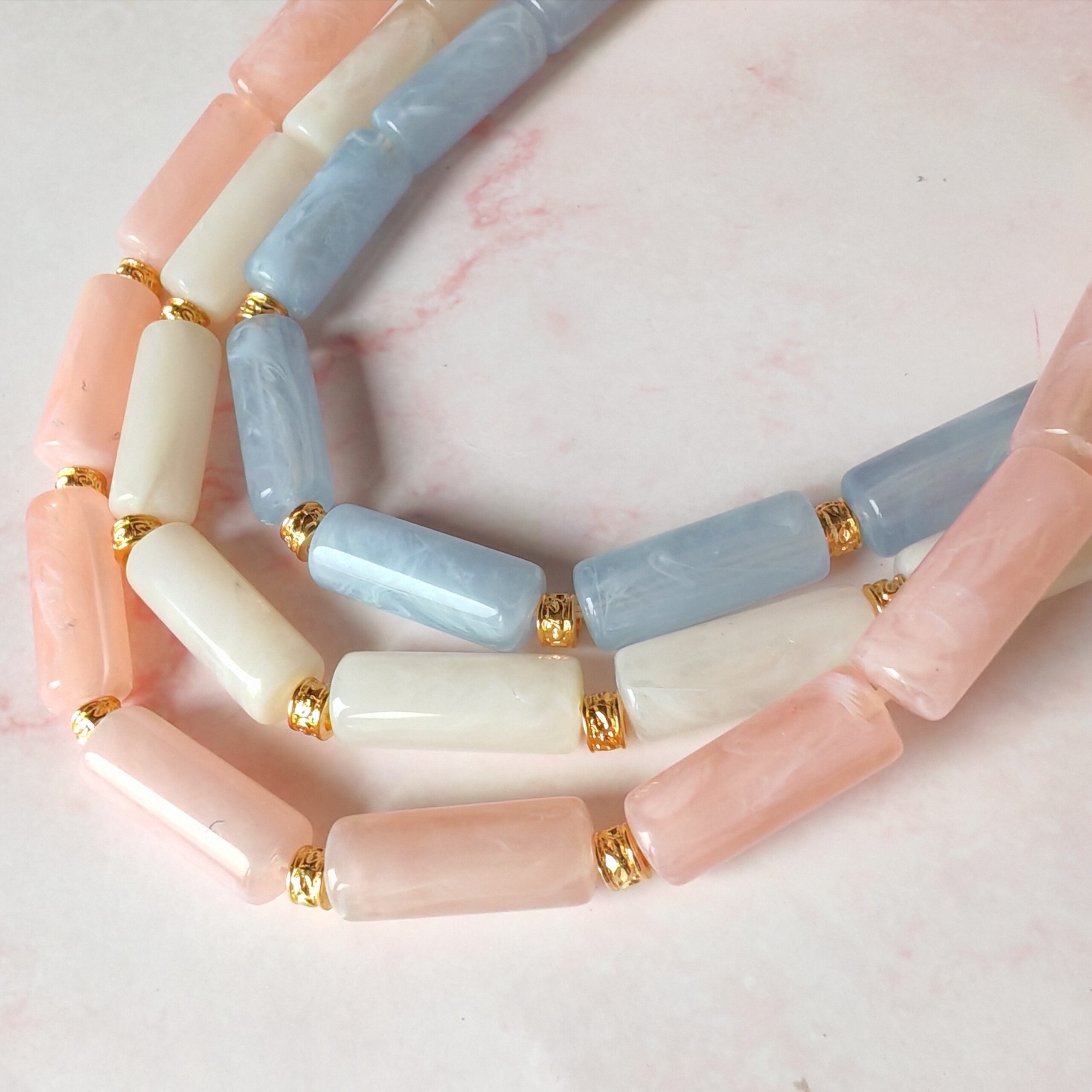 Perles en résine et acier inoxydable doré. Longueur 40cm.